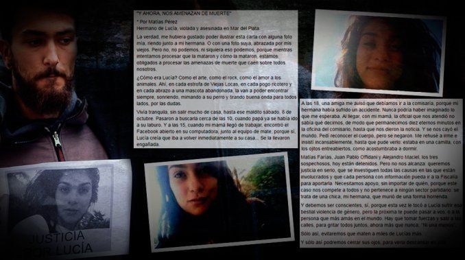 Además, el muchacho denuncia que su familia recibió amenazas, mientras que afirma que a su hermana se la llevaron "engañada", al tiempo que pide "justicia en serio" y que se investiguen la totalidad de las causas en las que están involucrados Matías Farías, Juan Pablo Offidani y Alejandro Maciel, los tres sospechosos del crimen.