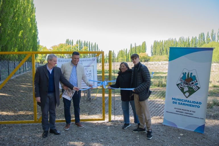 El intendente de Sarmiento, Sebastián Balochi, junto a los representantes de Pan American Energy (PAE), el gerente de Relaciones Institucionales, Horacio García, y Juan Taccari, referente del área, inauguraron el nuevo cerco perimetral para ovinos en la Escuela Agropecuaria N° 725. La obra es fruto de un esfuerzo conjunto entre el municipio y la empresa, permitirá que las ovejas estén en un lugar seguro en el predio de la institución.