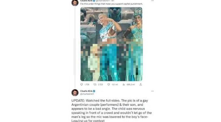 Tras ver el video completo de la situación, agregó: "ACTUALIZACIÓN: He visto el vídeo completo. La foto es de una pareja gay argentina (artistas) y su hijo, y parece ser un mal ángulo. El niño estaba nervioso hablando delante de una multitud y no se soltaba de la pierna del hombre por lo que el micrófono se bajó a la cara del niño - Dejando para el contexto".