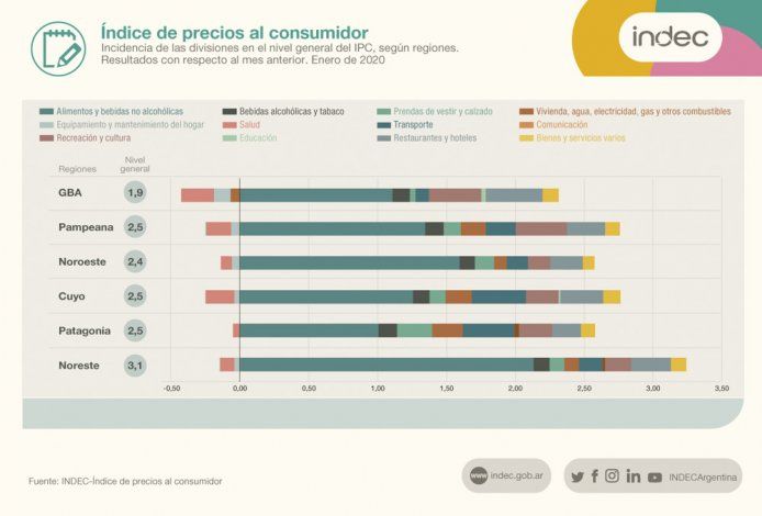 La inflación de enero de 2020 medida por regiones mostró un crecimiento de los precios de 1,9% en el Gran Buenos Aires; 2,5% en la región pampeana; 2,4% en el Noroeste; 2,5% en Cuyo; también 2,5% en Patagonia y 3,1% en el Noreste argentino.