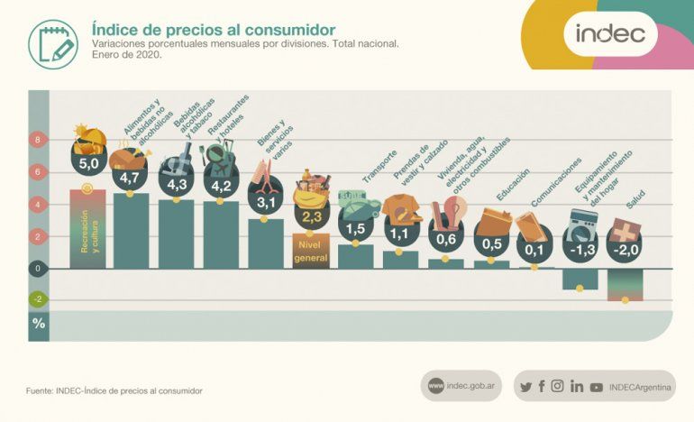 El INDEC también explicó la baja en la división equipamiento y mantenimiento del hogar, recordando que en enero se registró una baja, respecto a diciembre de 2019, en el rubro servicio doméstico porque en el último mes del año pasado se incluyó una asignación extraordinaria y no remunerativa dispuesta por el Ministerio de Producción.