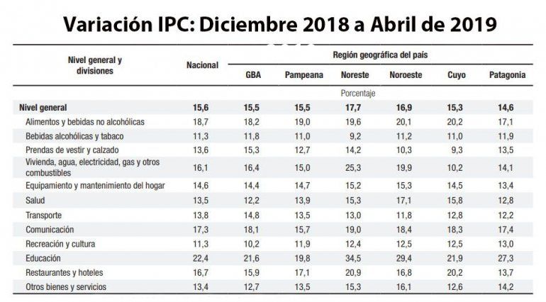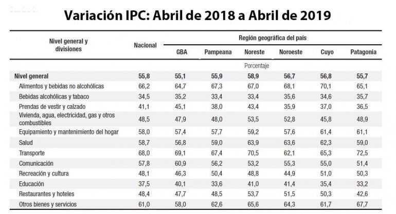 Mientras, en la medición interanual entre abril de 2018 y abril de 2019, el IPC en la Patagonia fue del 55,7% frente al 55,8% de indicador nacional. La región Noreste es la más afectada con 58,9% de inflación acumulada en esos doce meses, seguida por Cuyo con 56,8%; Noroeste con 56,7%; Pampeana con 55,9% y luego de la Patagonia con 55,7%, aparece Gran Buenos Aires con 55,1%.