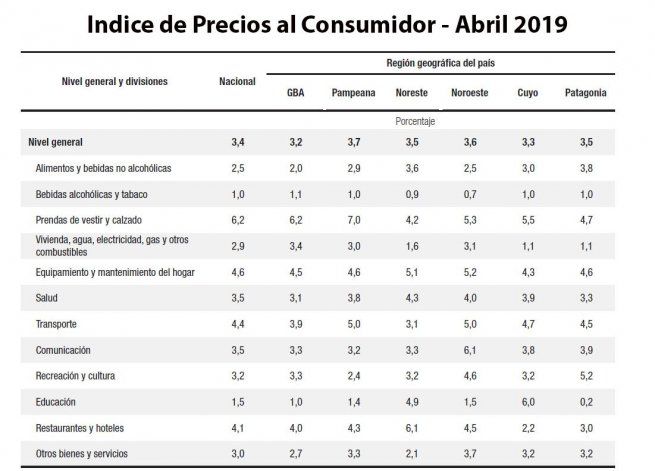 Al considerar la medición por regiones, el Indice de Precios del Consumidor de abril fue del 3,5%, una décima por encima de la media nacional. La inflación más elevada del mes se registró en la región Pampeana con 3,7%; seguida por la Noroeste con 3,6%; Noreste junto a la Patagonia con 3,5%; Cuyo con 3,3% y Gran Buenos Aires con 3,2%.