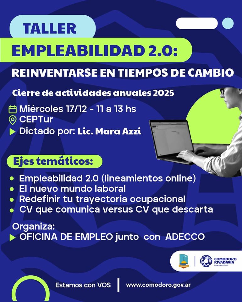 En cuanto a los contenidos que serán brindados en el taller, Carrazco sostuvo que “se estructurará en cuatro ejes temáticos centrales: I) Empleabilidad 2.0 y lineamientos generales; ll) Nuevo mundo laboral y las transformaciones actuales del mercado de trabajo; III) Redefinición de la trayectoria ocupacional, orientada a valorar habilidades y posibilidades de reconversión; IV) Currículum que comunica vs. currículum que descarta, donde se brindarán pautas sobre marca personal, uso de redes, inteligencia artificial y una actividad práctica de elaboración de CV”.