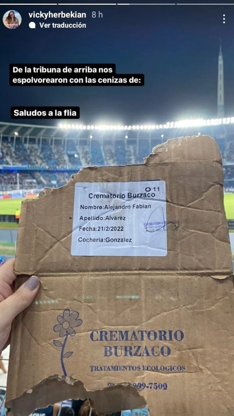 La usuaria Vicky Herbekian compartió la imagen en Instagram y escribió: “De la tribuna de arriba nos espolvorearon con las cenizas de:”. Y añadió: “Saludos a la familia”. Más tarde, en su cuenta de Twitter, detalló: “La historia fue así, apenas arrancó el partido nos comenzó a caer de la tribuna superior algo tipo arena, pensamos que era algo de la estructura del estadio y cuando vino el primer gol la arena se intensificó. Eso fue todo, hasta que al término del primer tiempo nos cayó la caja”.