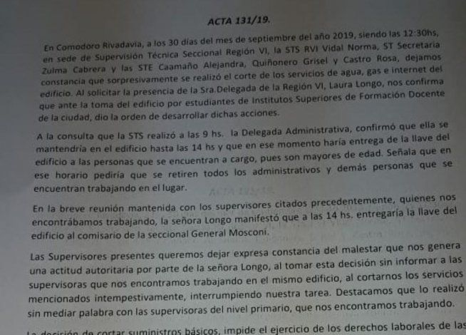 “Dejamos constancia que sorpresivamente se realizó el corte de los servicios de agua, gas e internet del edificio. Al solicitar la presencia de la Sra.Dele gada de la Región VI, Laura Longo, nos confirma que ante la toma del edificio por estudiantes de Institutos Superiores de Formación Docente ella se mantendria en el edificio hasta las 14 hs y edificio a las personas que se encuentran a cargo, pues son mayores de edad ese horario pediría que se retiren todos los administrativos y demás personas que s encuentran trabajando en el lugar. que en ese momento haría entrega de la llave". expresaron mediante una carta Vidal Norma, ST Secretaria Zulma Cabrera y las STE Caamaño Alejandra, Quiñonero Grisel y Castro Rosa, las trabajadoras del sector.