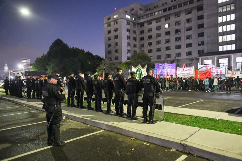 Este viernes el tercer piso de los tribunales de Retiro donde está el juzgado de Servini se llenó de abogados/a, familiares y amigos/as de las personas privadas de su libertad, en especial las que habían sido llevadas ahí para ser indagadas. Al resto ya los habían mandado inexplicablemente a cárceles federales. Cuando caía la tarde cerraron las puertas y no dejaban entrar ni a los letrados/as. Dos largas hileras nunca vistas de uniformados cruzaban de lado a lado el hall del edificio. Afuera de la mole de Comodoro Py 2002, donde crecía una manifestación contra las detenciones, la policía copó la zona, con sus exponentes de la motorizada, y amedrentaba a los manifestantes.