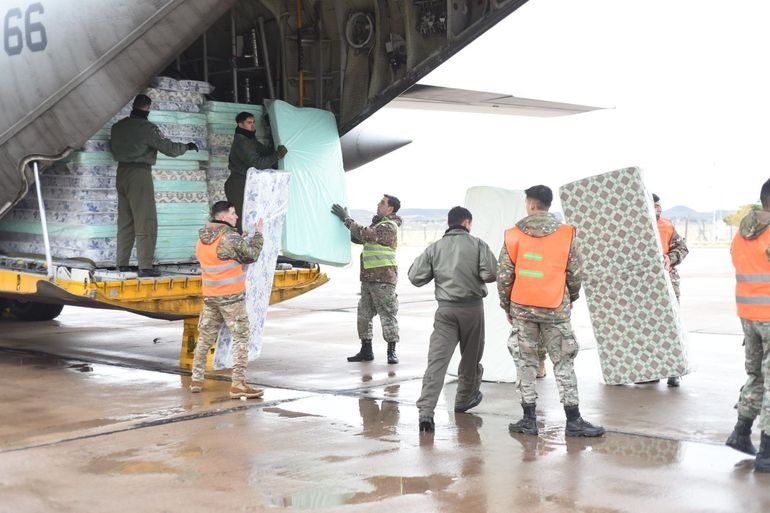 Mediante gestiones realizadas por el gobernador de la provincia del Chubut, Ignacio “Nacho” Torres, con el Gobierno Nacional, debido al temporal de lluvia y nieve que afecta a la provincia, arribó este domingo a Comodoro Rivadavia un avión Hércules de la Fuerza Aérea Argentina con provisiones de colchones, ropa y calzado.