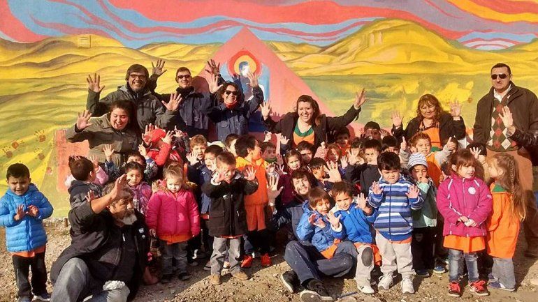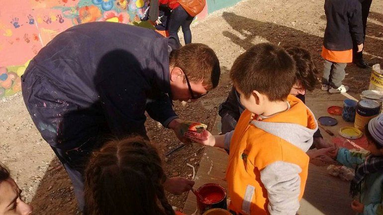 Los niños del Jardín "Pastor Alonso" se sumaron a las tareas de finalización del mural del Centro de Veteranos de Guerra.