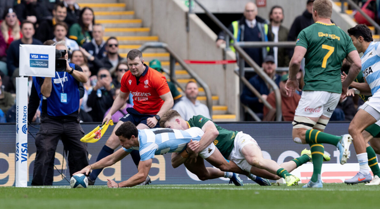 A pesar del descuento, los dirigidos por Felipe Contepomi no perdieron el foco y siguieron yendo al frente, buscando lastimar a la defensa sudafricana, que una vez más recaía en infracciones que le daban la chance a Los Pumas de ampliar la ventaja por intermedio de Santiago Carreras, a los 17 y a los 26 minutos de penal. Los sudafricanos acusaron el golpe y fueron a la carga con todo: primero con una jugada de line y maul contenida por la defensa argentina y luego con un scrum desactivado in-extremis por Los Pumas. No obstante, los Boks volverían a insistir con el scrum y sobre el final del primer tiempo Cobus Reinach apoyaba el primer try para los bicampeones del mundo. De esta manera, la primera etapa se cerraba 13 a 10 a favor de Argentina, informó la página de la UAR.