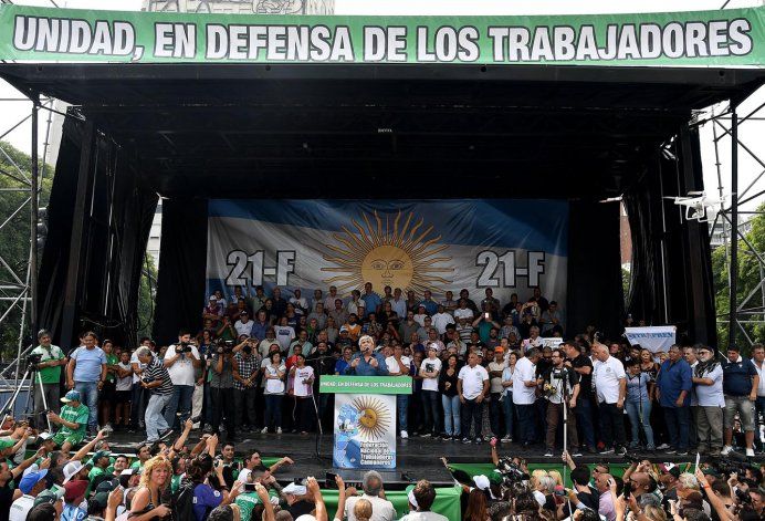 Moyano destacó la amplia convocatoria de “distintos sectores políticos e ideológicos” lograda para el denominado 21-F, que se leía impreso sobre una bandera argentina en el palco de los oradores, y aseguró que la 400 mil personas presentes estuvieron por “un solo objetivo: decirle al Gobierno, al señor presidente, no siga llevando políticas que hambrean a la parte más sensible de nuestra sociedad”.