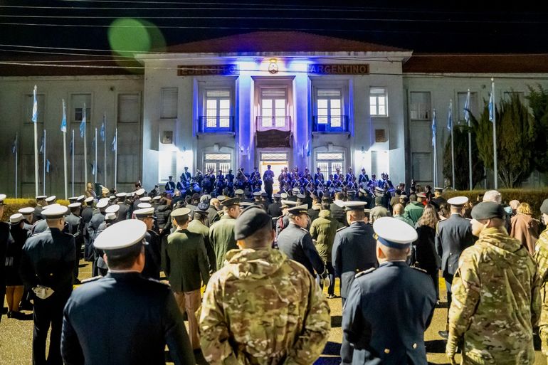 Como parte del acto, la banda militar del Regimiento de Infantería Mecanizado 8 “Comandante Mayor Matías Sarmiento” y la banda de la Fuerza Aérea” desplegaron un repertorio de marchas militares, entonando a las 0 horas de este martes las estrofas del Himno Nacional Argentino.