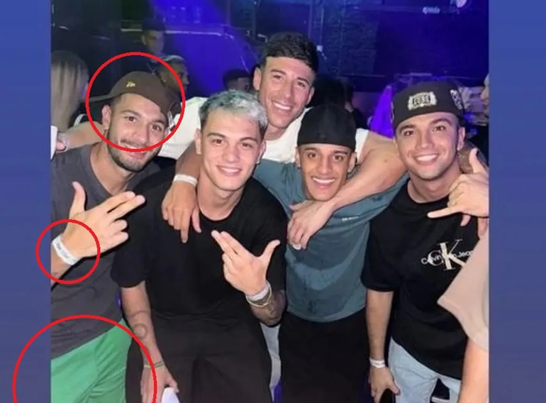 Luego de la fuerte colisión, todos los que acompañaban al jugador se bajaron de la camioneta y se dirigieron al shop del lugar. Uno de ellos, tenía remera negra, gorra marrón, un short verde con detalles blancos y una cinta en su mano derecha de color blanca. La misma vestimenta llevaba Mancuso en el boliche ubicado a seis cuadras del Obelisco porteño.