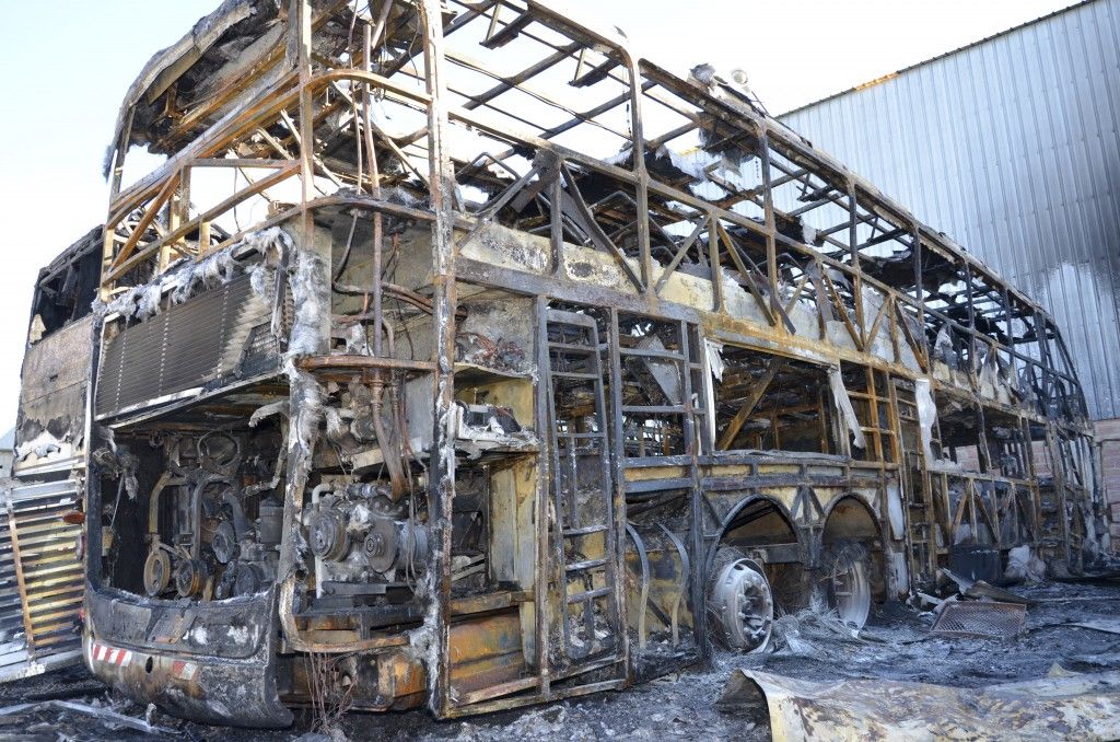 Un grupo de unas 50 personas, encapuchadas en su mayoría, ingresó ayer a la madrugada al predio de la empresa de transportes ETAP, en el barrio Industrial. Tras reducir al personal que se hallaba trabajando, lanzaron bombas molotov con las que incendiaron tres micros de larga distancia -uno de ellos de doble piso- y dos utilitarios de transporte de personal, además de destrozar los vidrios de las oficinas de administración y los cristales de siete vehículos más.