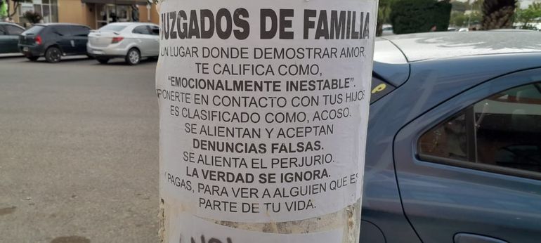 “Un lugar donde demostrar amor te califica como emocionalmente inestable. Ponerte en contacto con tus hijos es calificado como acoso”, señala uno de los textos que quedó pegado en la Oficina de Familia de Comodoro Rivadavia.