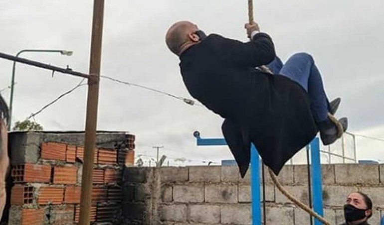 Además de exponer la modestia del equipamiento con que cuentan las fuerzas policiales para su entrenamiento, la imagen vuelve a exponer el afán de protagonismo del funcionario que no deja pasar ocasión de hacer ver sus destrezas y habilidades.