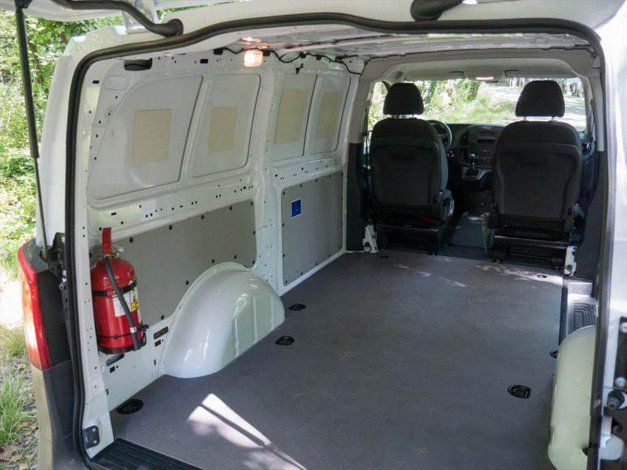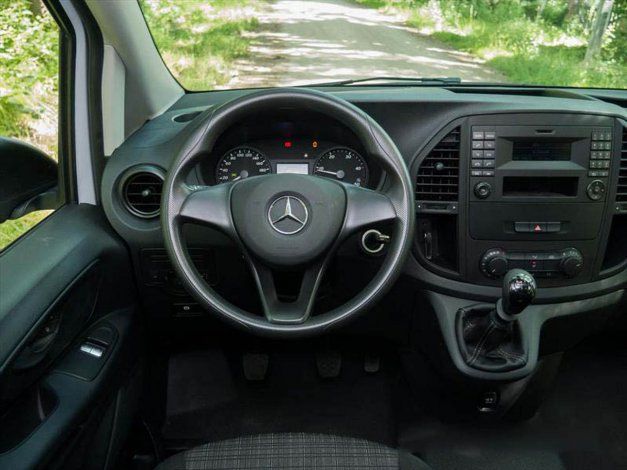 El habitáculo de la Mercedes-Benz Vito al principio puede resultar demasiado sobrio, austero e incompleto, pero a los 5 minutos de convivencia ya te das cuenta que tiene todo lo que necesitás para estar cómodo en el trabajo. Desde un sinfín de espacios portaobjetos por todos lados (un gran acierto de la marca considerando el uso que se le dará a este vehículo) hasta chiches que no creerías que podrían estar presentes como levantavidrio con one touch, estéreo con bluetooth/USB y una completa computadora de a bordo.