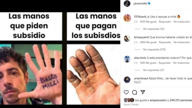 El Presidente compartió una imagen del actor donde en su mano mostraba un cartel que decía "Basta Milei", en la que arriba comentó: "Las manos que piden subsidio". A su vez, creó un paralelismo con la mano de un trabajador donde expresó: "Las manos que pagan los subsidios".