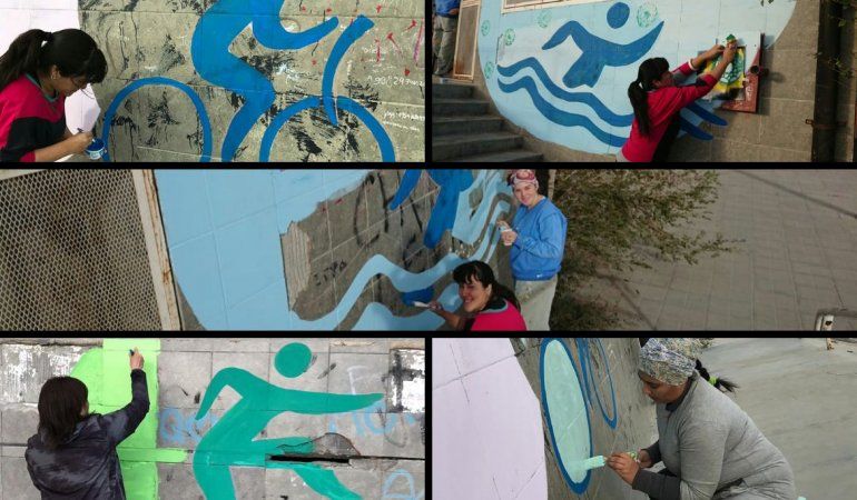 Convocados por el equipo directivo de la Escuela N° 797, escuela secundaria con modalidad de Educación Física, la única con esta orientación de la ciudad, ubicada en el barrio San Martín en las calles Huergo y Las Violetas muralistas pintaron el edificio de la insitución.