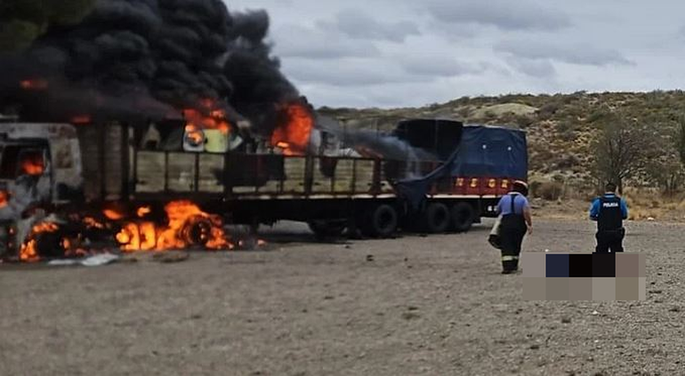 Al arribar, los efectivos encontraron el vehículo envuelto en llamas, con el incendio ya desarrollado en forma generalizada. El fuego afectaba por completo al camión, con especial intensidad en el sector del motor y la cabina. En el exterior del rodado fue hallado el cuerpo del chofer, quien ya no presentaba signos vitales.