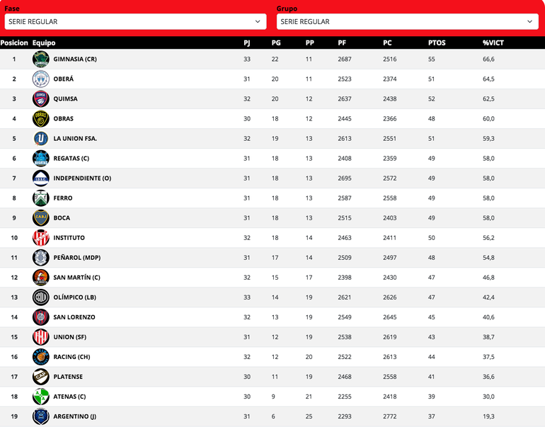 Gimnasia (22+23+21+15): Emiliano Toretta (x) 10, Federico Grun 5, Martiniano Dato 24, Anyelo Cisneros 13 y Bryan Carabalí 4 (fi); Mauro Cosolito 9, Marcos Chacón 10, Carlos Rivero 0, Sebastián Carrasco 4 y Kenneth Horton 2. DT: Pablo Favarel.