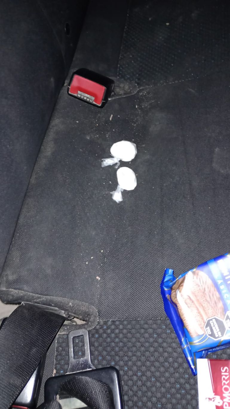 Al descender del rodado, el hombre arrojó una bolsa de nylon que contenía varios tubos de plástico (capuchones). En tanto, en el asiento trasero el hombre también había dejado dos envoltorios de una sustancia polvorienta de color blanco.