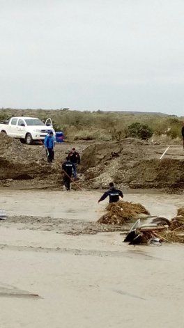 A través de pasamanos y sostenidos en los extremos con sogas, el personal de Prefectura realizó esa tarea para acercar elementos de primera necesidad, que luego fueron trasladados en vehículos para que lleguen a los vecinos afectados.