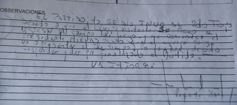 "Acá está (muestra la copia), yo no invento nada. Aparte, habla de 'partido suspendido' y por otro lado en el párrafo dice 'por finalizado'. Si es así, el resultado es 1 a 1. Tampoco explica por qué Newbery no quiso salir a jugar, sólo que se esperó el tiempo prudente. Pero no dice las razones", resaltó.