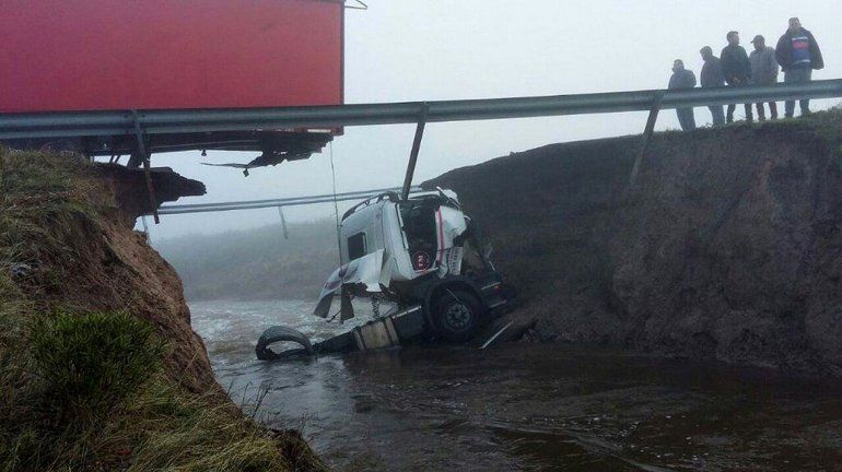 Durante la madrugada de ayer un transporte de carga que se dirigía desde Trelew hacia esta ciudad cayó sobre una inmensa grieta que se produjo a la altura del kilómetro 1690 de la ruta Nacional 3, a unos 20 kilómetros de Garayalde. Fue por el socavamiento del terreno provocado por las intensas lluvias. La cabina del camión cayó al vacío y su chofer sólo sufrió contusiones, se informó.