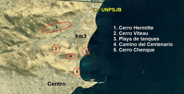 En cambio, hacia el sur de la Universidad, el escenario cambia de manera significativa. Allí afloran rocas de tonalidades marrón claro, con mayor contenido arcilloso, pendientes pronunciadas y cerros de mayor altura, como el Hermitte, el Viteau, el Chenque o el Antena. Estas características corresponden a la Formación Chenque, cuyos materiales tienen mayor capacidad para retener y transportar agua, un factor clave en la inestabilidad del terreno.