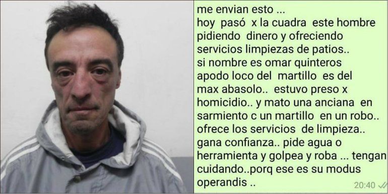 En las últimas horas comenzó a circular en Facebook y a través de WhatsApp un mensaje – con foto incluida - alertando a vecinos de Rada Tilly sobre la presencia de Omar Quinteros, un sujeto con graves antecedentes policiales.