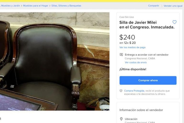 "Silla de Javier Milei en el Congreso. Inmaculada", dice el título de lo que simula ser una publicación de venta en un reconocido sitio de e-commerce, y aparece junto a una foto de la banca que ocupa el economista libertario con su bloque. "Casi sin uso", se puede leer sobre el estado del "producto" a ofertarse.