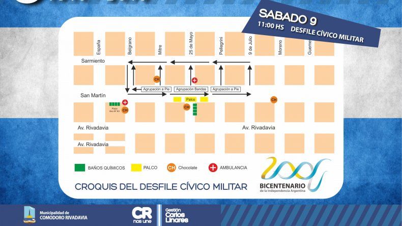 Por otra parte, el funcionario precisó que el palco institucional estará posicionado sobre San Martín y 25 de Mayo, "donde habrán ambulancias para poder atender cualquier emergencia" y solicitó precaución para los automovilistas que circulen por el casco céntrico, ya que "la zona de calle Belgrano a Ameghino y España a San Martín; se verán afectadas por la formación de las distintas instituciones tanto deportivas, educativas, civiles como militares que participarán del desfile".