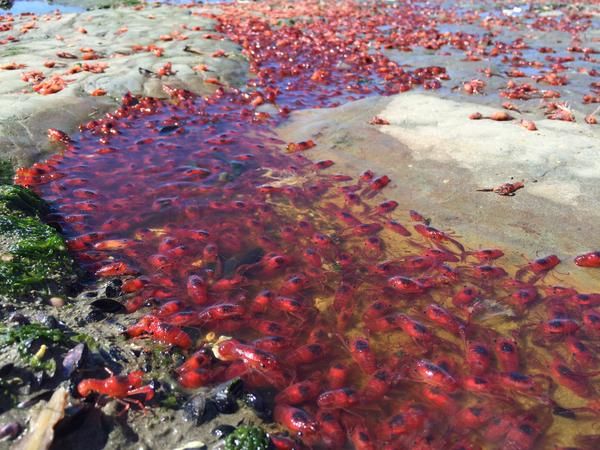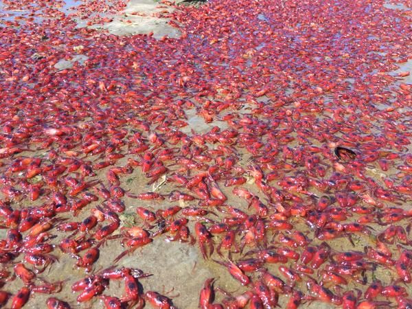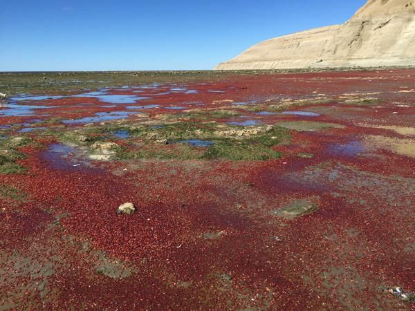 En la tarde de ayer se difundieron imágenes a través de las redes sociales sobre la presencia de un “manto” rojo de pequeños crustáceos que cubrían parte de la arena en la playa de Rada Tilly.