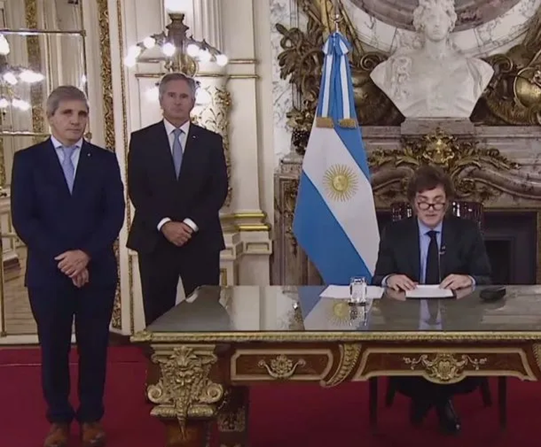 Con el mandatario en el centro de la pantalla leyendo su mensaje, a su izquierda se colocó el ministro de Economía, Luis Caputo, y el secretario de Finanzas Pablo Quirno; mientras que a la derecha, el titular del Banco Central, Santiago Bausili, y el vicepresidente del Banco Central, Vladimir Werning.