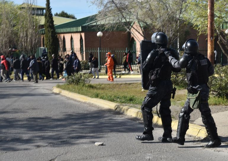 Luego, alrededor de las 11.00 todos los grupos de desplazaron hasta el edificio municipal pasando lateralmente por los policías apostados a quienes les arrojaron algunas piedras, tal como había ocurrido en la rotonda de Termap.