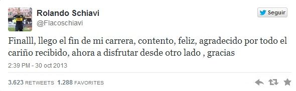 "Final, llegó el fin de mi carrera. Contento, feliz, agradecido por todo el cariño recibido. Ahora a disfrutar desde el otro lado, gracias", así anunció Rolando Schiavi en las redes sociales su retiro definitivo del fútbol profesional. Su equipo ganó por 2-1 en su despedida y así el Flaco le puso punto final a una extensa y exitosa carrera. Continuará relacionado al deporte como integrante del cuerpo técnico de Martín Palermo en Godoy Cruz.