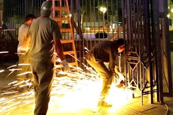 Una cuadrilla de unos diez hombres inició el trabajo durante la noche del domingo, que continuó el lunes por la mañana, mientras al mismo tiempo se monta el escenario donde el Frente de Todos celebrará la asunción de Alberto Fernández.