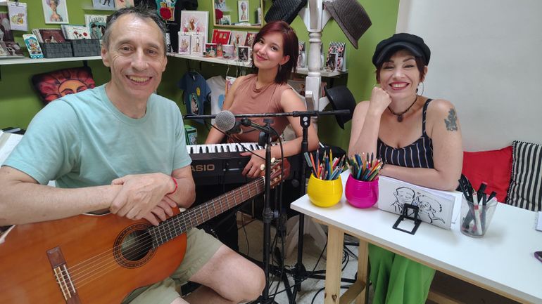 La experiencia está a cargo de Sarao Canciones Ilustradas, una formación que articula distintas disciplinas escénicas. La estructura musical encuentra en César Fabián Fredini un sostén vinculado al folklore y al tango, con antecedentes en dirección coral y en propuestas líricas como Amistad Sur y Malagma. La identidad visual se construye en escena a partir del trabajo de Liliana Ostrovsky, ilustradora y caricaturista comodorense que, tras más de veinte años en Brasil participando de proyectos culturales y solidarios, regresó a la ciudad y fue pieza clave en la gestación del colectivo. Su trazo no ilustra la música: la interpreta.