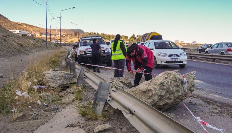 Las piedras y escombros quedaron tras el guardrail y a la espera de que se movilice a personal vial de la Municipalidad de Comodoro, cabe señalar que esta área no trabaja con guardías por lo cual la logística es un tanto compleja.