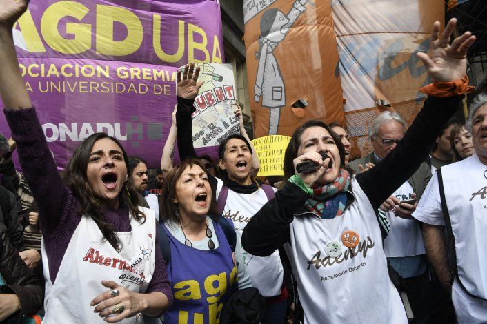 Gremios docentes y agrupaciones de izquierda realizaron este mediodía una protesta en la zona del Obelisco porteño, en el marco de una jornada de duelo y paro nacional por la muerte de dos maestras en un accidente de tránsito cuando regresaban de una marcha de protesta en Chubut.