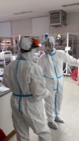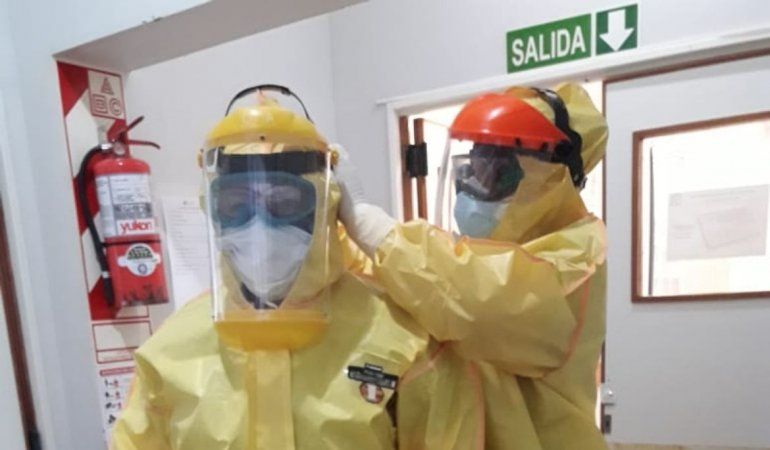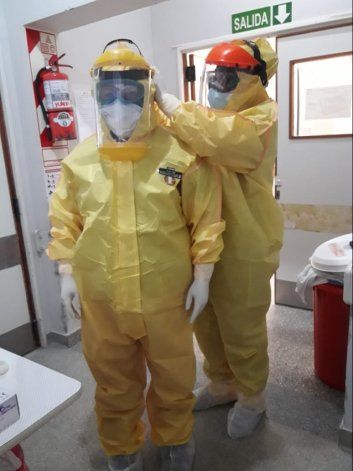 El ritual comienza con la llegada al Hospital Regional. Todos los profesionales deben sacarse la ropa que traen de sus casas para ponerse un ambo; luego viene el overol cerrado y sellado para después colocarse unas máscaras “total face”, que cubre todo su rostro, seguido de unas antiparras.