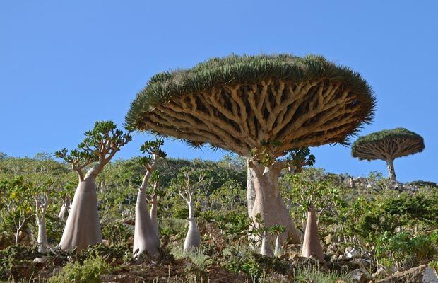 La imagen típica de la isla es la dragonera de Socotra (Dracaena Cinnabari). Este árbol mágico tiene su copa en forma de paraguas, con gruesas ramas y hojas carnosas que atrapan cualquier posibilidad de humedad. Estos enormes árboles dibujan el perfil de las montañas.