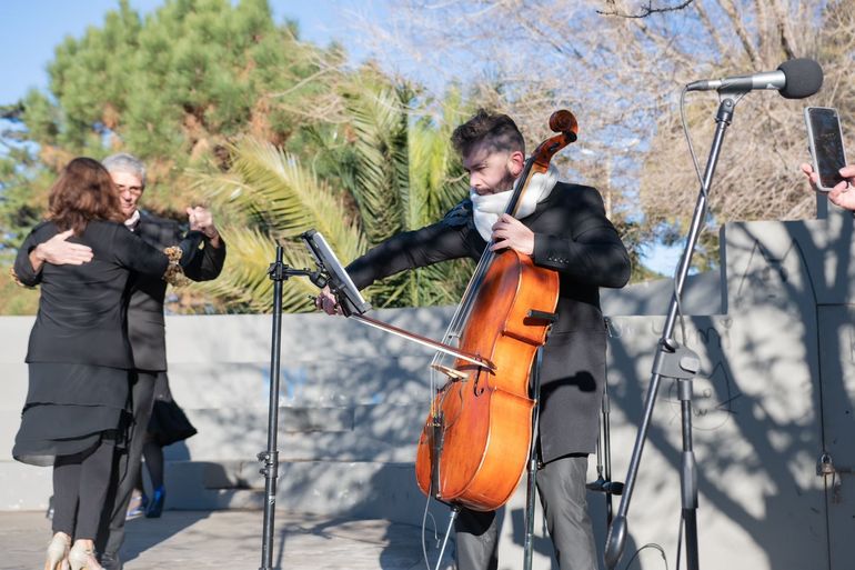 En este marco, integrantes del Taller Municipal de Tango de Rada Tilly bailaron “Cambalache”, “Pasional” y “9 de Julio”. Además, el artista Nacho Mena cantó y tocó el violonchelo.