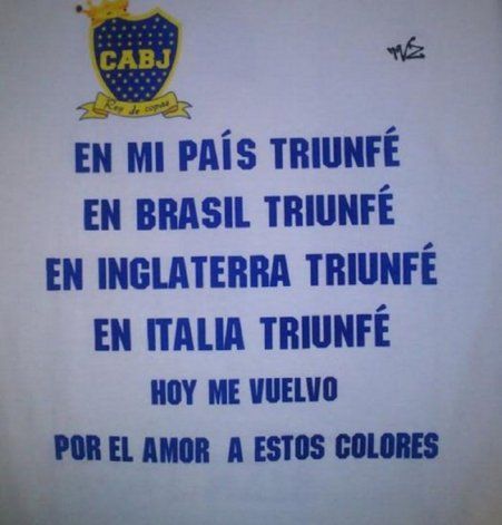 "En mi país triunfé, en Brasil triunfé, en Inglaterra triunfé, en Italia triunfé. Hoy me vuelvo por amor a estos colores", reza la remera blanca con letras azules que seguramente será arrasada por los hinchas de