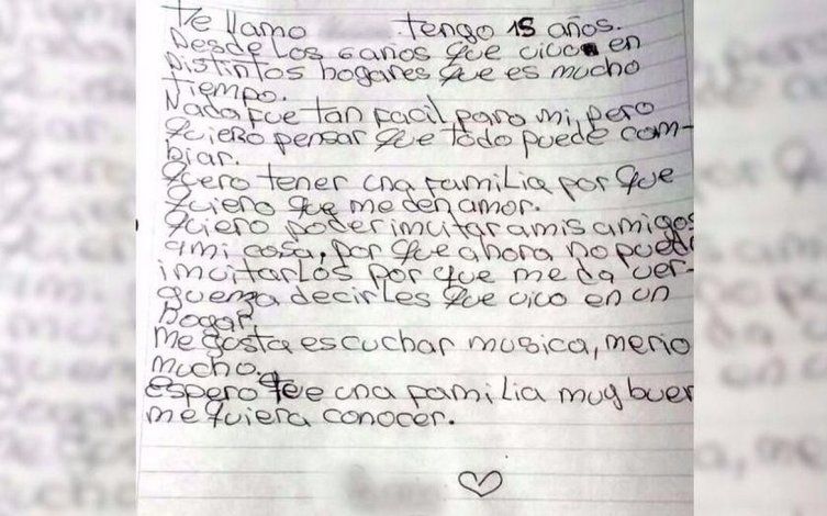 “Quiero poder invitar a mis amigos a mi casa, porque ahora no puedo invitarlos porque me da vergüenza decirles que vivo en un hogar. Me gusta escuchar música, me río mucho. Espero que una familia muy buena me quiera conocer”, continúa el texto.