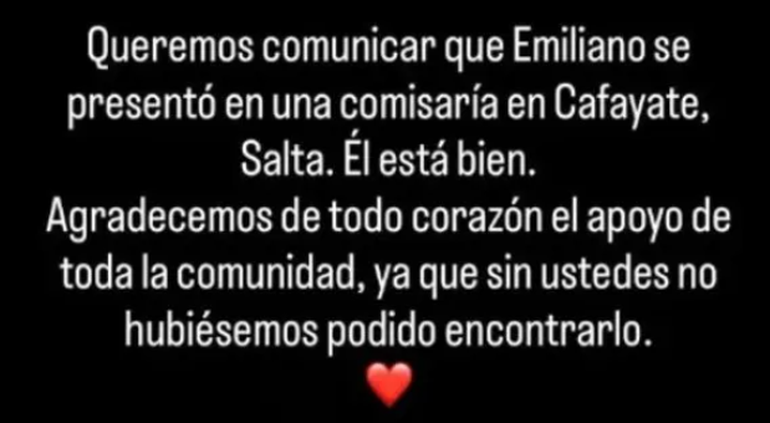 La noticia fue comunicada por su madre, Roberta Gambini, a través de las redes sociales. “Queremos informar que Emiliano se presentó en una comisaría en Cafayate, Salta. Él está bien. Agradecemos de todo corazón el apoyo de toda la comunidad, ya que sin ustedes no hubiésemos podido encontrarlo”, expresó.