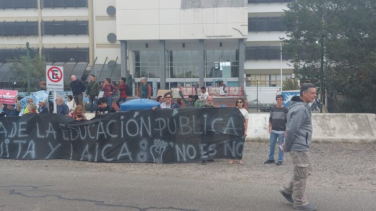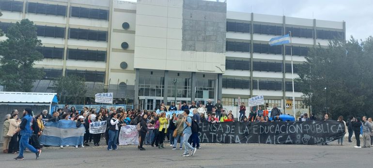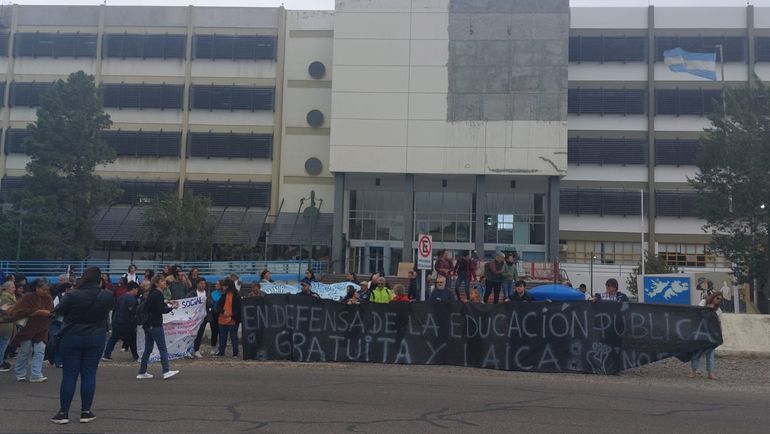 En el marco de las jornadas de lucha que se están desarrollando en la Universidad Nacional de la Patagonia San Juan Bosco, tanto en la sede de Comodoro Rivadavia como en la de Trelew, y en sintonía con el paro nacional del jueves, se llevó a cabo un abrazo simbólico en la sede de Kilómetro 4 de la casa de altos estudios.
