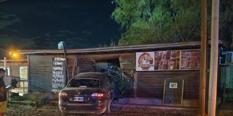Un violento accidente de tránsito se registró en las primeras horas de este martes en Km 14, cuando un automóvil perdió el control y finalizó su recorrido dentro de la rotisería "El Rey Pollo".