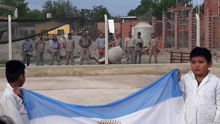 En la misma se ve a un grupo de obreros de la construcción que realizaban trabajos en las proximidades de una escuela y cuando empezó a sonar el himno argentino, los hombres dejaron sus herramientas a un lado para ponerse de pie y cantar.